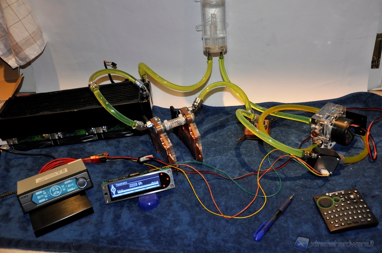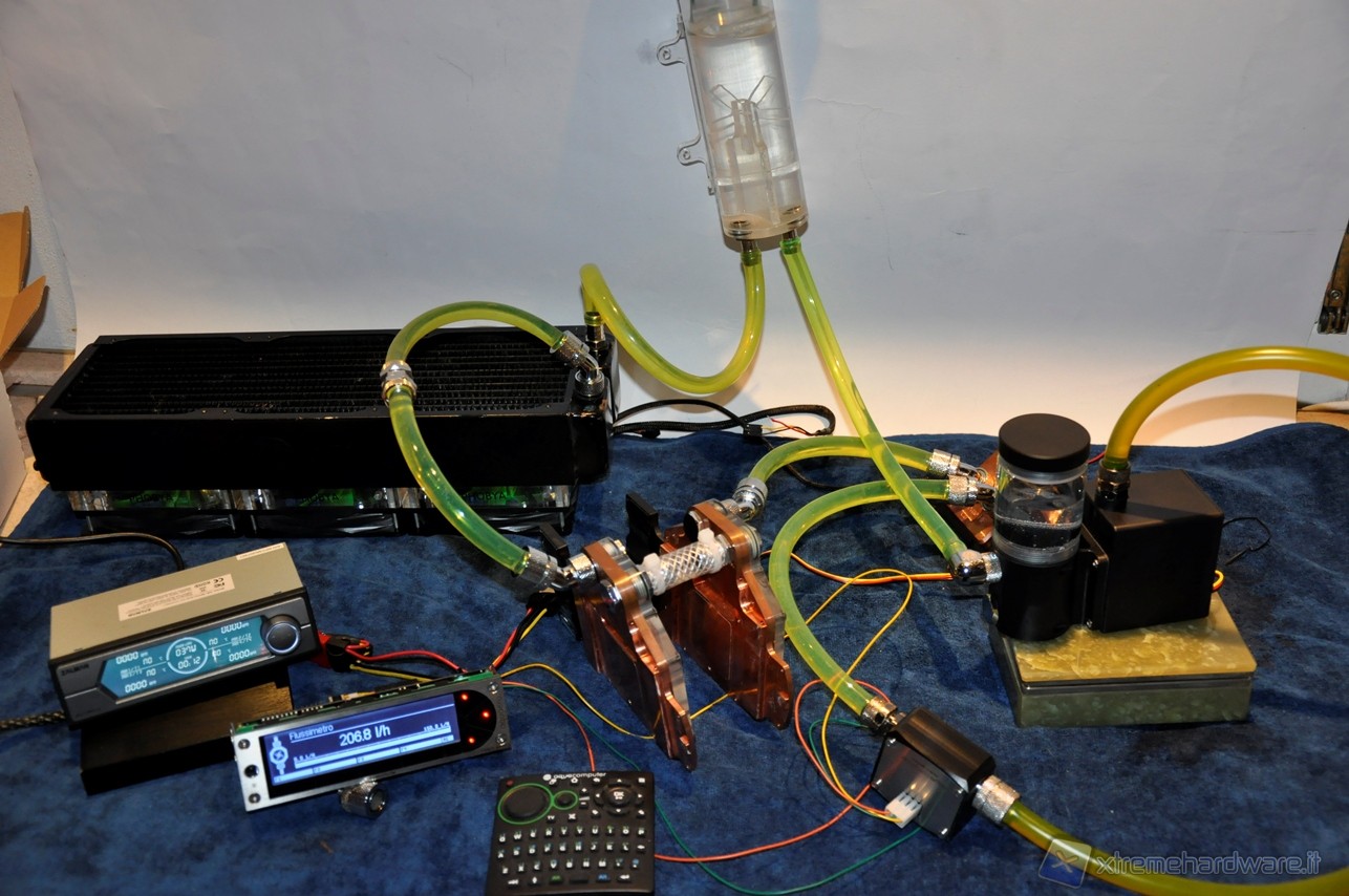La Alphacool VPP655 corredata di HF Top Plexi D5 si è posizionata nella fascia media, battendo la Phobya DC400 ma non la Swiftech MCP355, avvantaggiata dal TOP Reservoir della XSPC. Abbiamo quindi aggiunto al circuito altri 2 waterblock per sovraccaricare ulteriormente il lavoro delle pompe e vedere come scalano in prestazioni. Lo schema è il seguente: